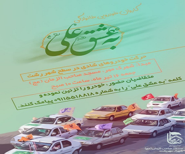 کاروان خودرويي خانوادگي" به عشق امام علي (ع)" در روز عيد غدير از مسجد صاحب الزمان(عج) مسکن مهر رشت حرکت ميکند.